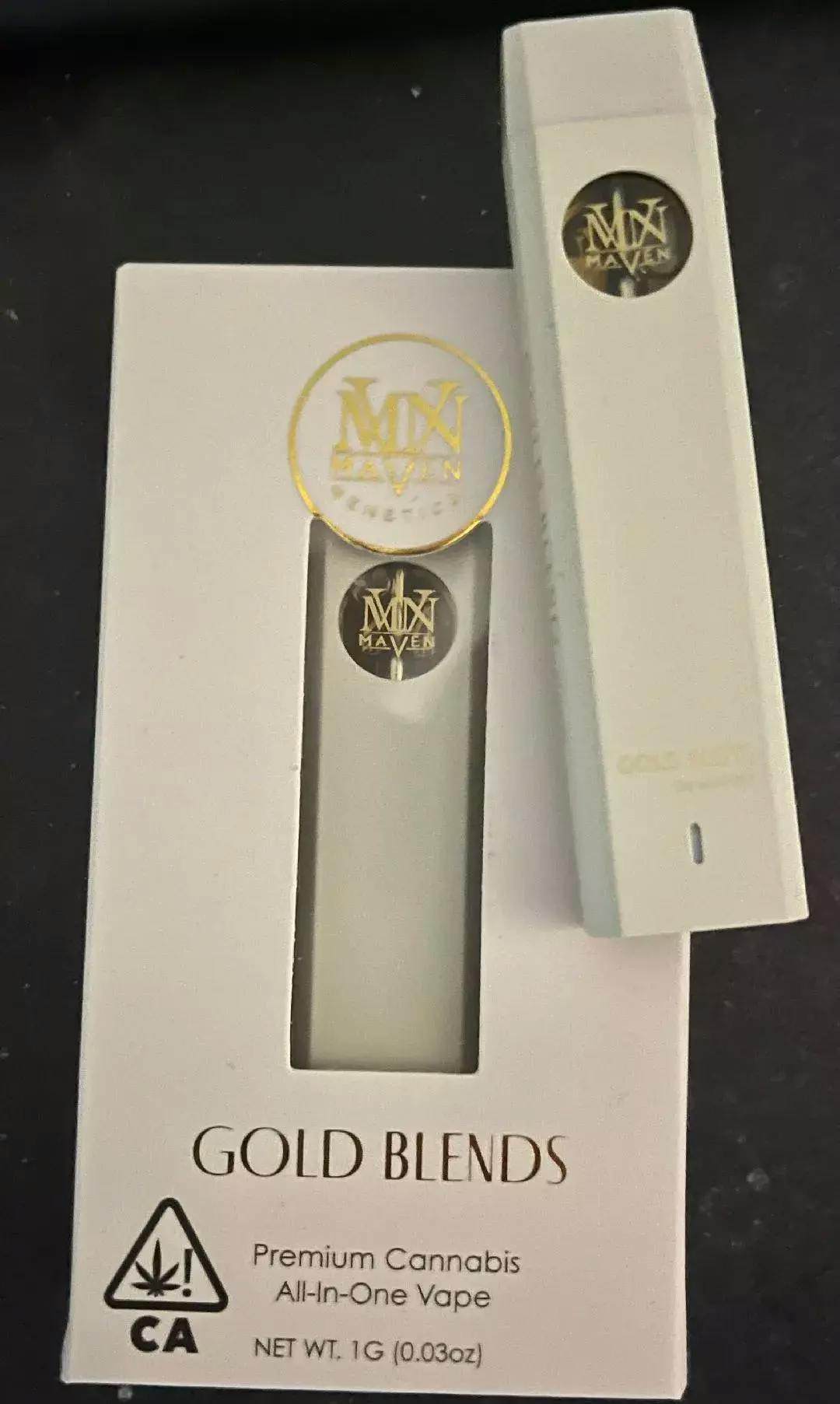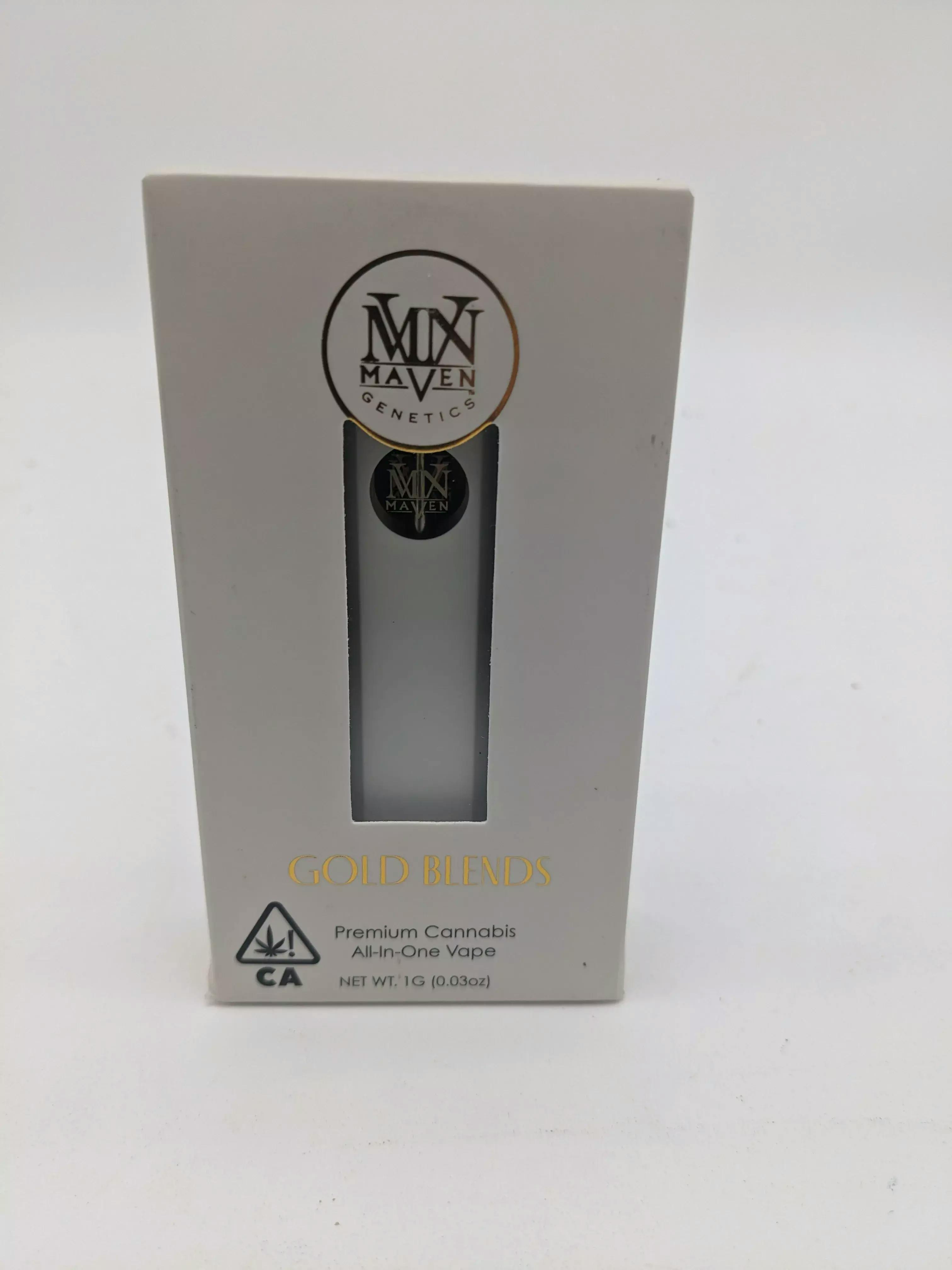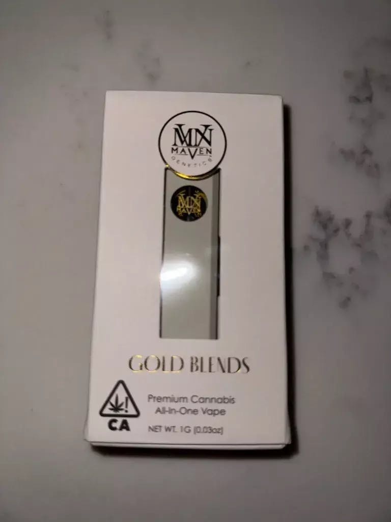 The Gold Blends All-In-One Vape offers sophistication and convenience and is designed to enhance your experience with exceptional ease. This sleek, user-friendly disposable features a rechargeable design and a spacious 1-gram oil capacity for prolonged use. Each draw delivers a smooth, consistent flavor that parallels the excellence of our signature Maven strains.